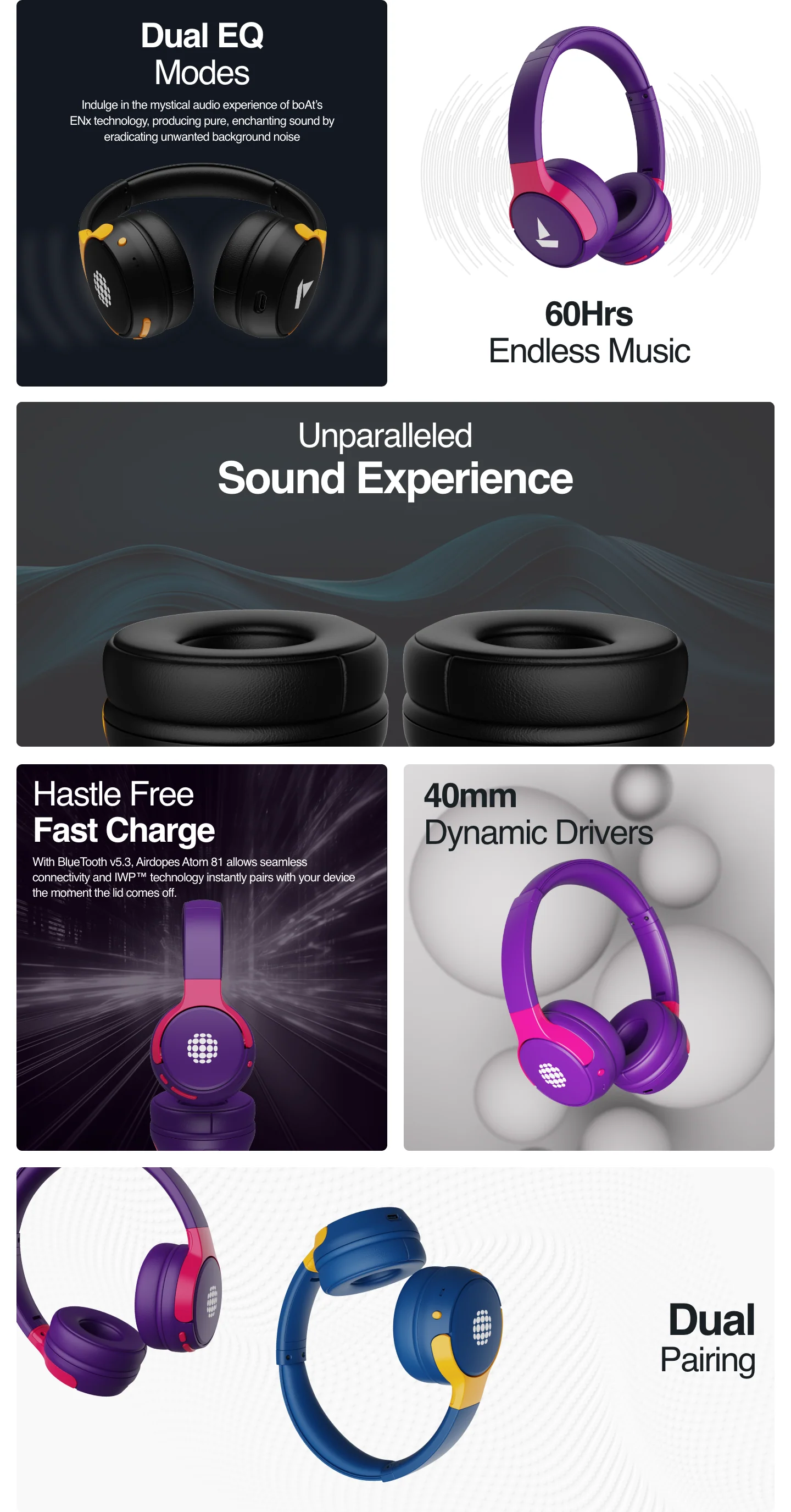 boAt | Sunburn Rockerz 650 - Wireless Bluetooth Headphones Catch the faintest beat clearly with the fresh new Rockerz 650 wireless headphones. Indulge in a ceaseless, pure audio bliss with its unbelievable 60HRS of playback. Never let the good times fold with its ASAP charge technology that provides 8HRS of playback with just 10 minutes charge. The Smart Twist enables you to play or pause your music hassle-free. Moreover, its dual EQ Modes along with boAt Signature Sound ensures that your music game goes beyond the roof. Who doesn’t want the finest listening experience? Here’s your chance. Presenting, boAt Rockerz 650.