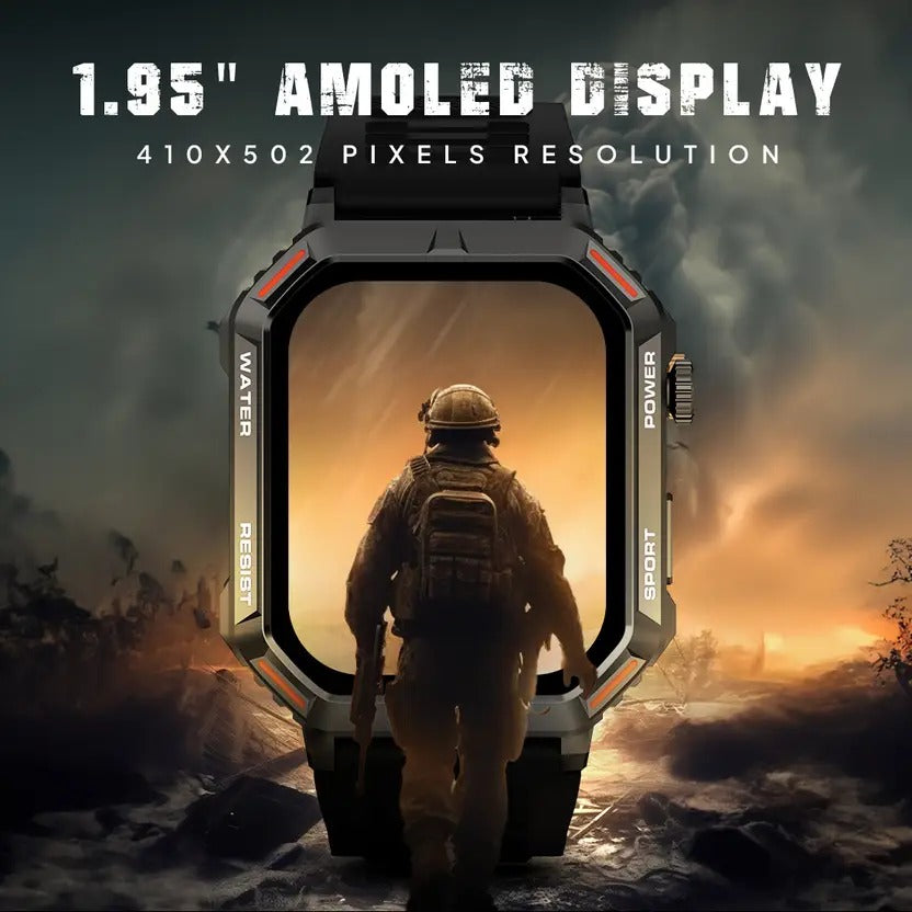- .95 AMOLED display, zinc alloy middle frame - Commando redefines ruggedness with a 1.95 AMOLED display, blending resilience with style. Its zinc alloy middle frame ensures durability, embodying a perfect fusion of toughness and sophistication. 123 sports modes, health monitor - Commando excels in both performance and well-being, boasting 123 sports modes that adapt to your active lifestyle. Its comprehensive health suite empowers you to conquer fitness goals with strength and style. 7 days battery life, 25 days standby - Standing the test of time with a remarkable 7-day battery life and 25 days standby, Commando merges longevity with dependability. Just as its sturdy build, this endurance empowers you to face challenges with unwavering strength. Bluetooth calling, voice assistance - Commando bridges communication seamlessly with Bluetooth calling, while voice assistance enhances convenience with a touch of rugged elegance, echoing unwavering strength in connectivity and functionality.